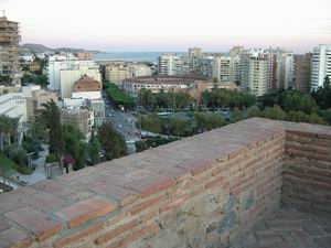 こうして中世の異空間をたどりつつアルカサバの丘を登ると、21世紀の市街や海を一望する高台に出る。 正面に見える円形の建物は闘牛場。その先に見えるのは地中海だ。 海辺に出たいと思ったが、ダウンタウンの前に広がるのはビーチではなく港。一般人が散歩に行くような雰囲気ではなかった。 |