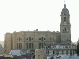 | アルカサバの高台から眺めたカテドラル。窓の配置が何やらロボットの顔みたいだ。 海沿いの町だけに、マラガは風が強かった。気温は、おそらく東京と同じぐらいだろう。セビリアは少し内陸である分、昼の気温が高く、一方、さらに内陸のマドリードは、逆に朝夕が冷え込んだ。 |