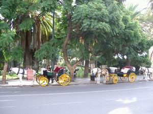 | マリーナ広場で客待ちをする観光馬車。というわけで、この町もセビリアと同様、蝿だらけだった。 ちなみにマラガはピカソの出生地。ピカソ美術館があるほか、彼の生家も公開されている。ただし、どちらも職員がすごく高飛車で、まるで刑務所。特に生家では、見張りの職員が影のように後をついてきた。ということは、展示物にインクをかけちゃったりする不届き者がいるんでしょうねえ。 |