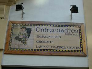 | ピカソ美術館に近い商店街で見かけた陶器の看板。何を売る店なのだろうか。お気づきの通り、描かれているのはピカソの絵だ。 この商店街の土産物店で絵葉書を買ったら、店員が「****コンニチワ****」と同僚に言う。おそらく「この間、日本人の客に挨拶を教わったよな、コンニチワだっけ?」みたいな内容ではないかと推測し、こちらから「コンニチワ」と声をかけておいたが(店員たちは破顔一笑)、実際には「この間、コンニチワとしか言わないアホな東洋人が来たよな」みたいな話だったのかもしれない。神のみぞ知るだ。 |