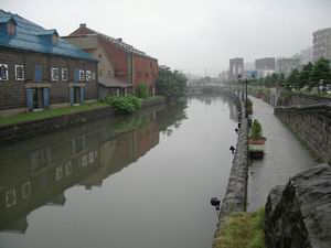 | 雨に煙る小樽運河。小樽観光の目玉だが、遊歩道が整備されているのは、奥に見える隣の橋までだ。飛騨高山と同じで、全市にこういう光景が広がっているわけではない。 左手に見える倉庫群は、すべてレストランやお土産屋に姿を変えている。 アジア系の外国人観光客が多かったな。 |