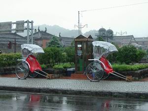 | 観光用の人力車が何台も出ていたが、この雨では乗る人もいない。ちなみにどうも肌寒いなと思ったら、温度計には午後4時半現在で気温が16.5度と表示されていた。 背後の屋根にシャチホコが見えるのにお気づきだろうか。今は博物館や観光案内所となった旧小樽倉庫である。この地のお大尽の、かつての栄華をしのばせる。 |