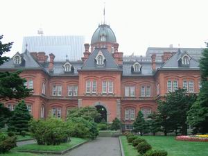 | 北海道庁旧本庁舎。21年前に訪ねた時には、工事用のシートで半分が覆われていたが、今回初めてその全容を見ることができた。私が行く前日に、21年がかりの工事が終わったという話も(ないない)。 出っ張った中央部分の2階が知事室である。 |