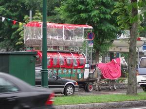 | 大通公園で客待ちをしていた観光馬車。やはり雨の中では客足も少なかったようだ。 しかしこれだけ大きな客車に、1頭の馬しかつないでいないのだが、満員になっても動くのだろううか? 公園内には茹でたトウモロコシやジャガイモを売る屋台がたくさん出ていた。雨でなければ食べたかったんだけどね。 |