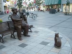 | 旭川市中心部の歩行者専用道路で見つけたサックス吹きのオジサン&ネコ。 旅の最後にお土産をそろえる。旭川といい、小樽といい、北海道の商店員さんは全般に無愛想ですね。「あんたが買いたいなら、売ってやってもいいけどね」と言わんばかり。沖縄の売り子さんがホスピタリティ満点なのと好対照なんでないかい? |
