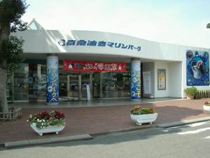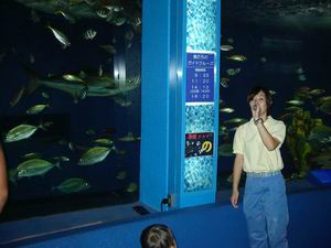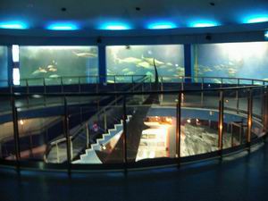 | こちらはオスで、メスの1.5倍から2倍ぐらいの大きさがある(目測)。雌雄の大きさが格段に違うのは一夫多妻型の動物の特徴。この「あしか島」でも、彼は2人の妻を抱えていた。 飼育員さんがアシカに投げ与えているのはサバだそうです。 ところで背後の建物「魚の国」が円環状をしているのにお気づきだろうか。内部はどうなっているかというと・・・。 |