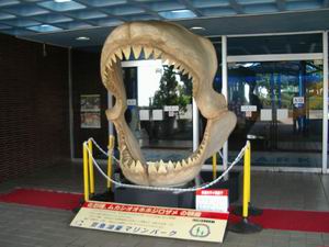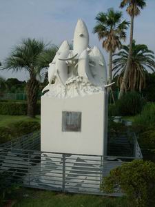 | その一方、志半ばで(?)倒れた魚や海獣たちも数多くいる。この碑は、そうした動物たちをまつったもの。 敷地の一角の、太平洋を望む高台に設置されている。 |