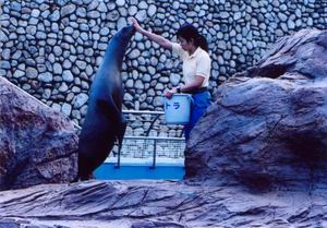 | カリフォルニアアシカのお食事タイム。ショーに出るアシカではないようだけど、軽く芸などやらされております。 横になっていると大きさが実感できないけど、こうして飼育員さんと並んで立つと、ほぼ同じ体長ですね。ちなみにこれはメス。 |