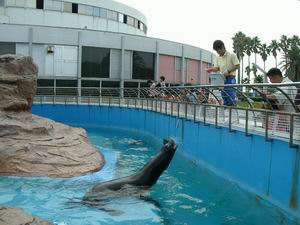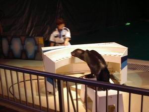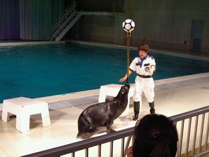 | こちらはアシカ(オルガン)、オタリア(ボーカル)、イルカ(コーラス)という構成で童謡「アイアイ」を演奏する一幕。・・・というのは成功した1回目の話。 2回目はアシカが演奏直前に逃走した。感服したのはその事故処理だ。こうしてオタリアをオルガンに回し、何事もなかったように演奏を終えた。2回目だけ見た客は、単にそういう段取りなのだと思ったはずだ。でも、これだけ危機管理が素早いということは、こうした事故がしばしば起きているということか? 見てください。オタリアにもちゃんと肩甲骨があるんですね。 |