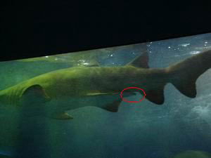 ちなみにこれが「ドーナツの海」の一番の大物。全長3mを超えるサメ、シロワニだ。延々と右から左に泳いでいたけれど、たまには向きを変えることもあるのかしらん? つがいで飼われているのだが、ガイドのお姉さんによると、下腹部の突起で雌雄が見分けられるとか(何ための突起かはご想像の通り)。 写真ではわからないが、突起は2本横に並んでいる。ふ〜ん、サメってそうなんだ。3Pができますね。しないって。てゆーか、品がないって。 |