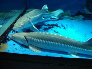 | こちらは別の水槽。サメはサメでもチョウザメの仲間だ。シロチョウザメ、バルチックチョウザメ、シベリアチョウザメなどが重なり合うように飼われているが、別にケンカにはならない様子。 説明表示によれば、ここのチョウザメには「アラサー」や「アラフォー」がゴロゴロいる。開業当初から生きてるってことですよね。つおい。 |
