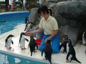 | こちらは「ペンギン島」のお食事タイム。ここにはキタイワトビペンギンが20羽あまり暮らしている。 バケツを持った飼育員さんに寄ってくる奴、完全無視の奴と個性は様々。寄ってきたくせに、魚を差し出されても食べない奴も。やはりこれはショーとしてのおやつで、本当の食事は別にもらっているのでしょうね。 お姉さん、時々かまれて「イタタ」と言っていた。歯がないからいいようなものの、やっぱり大変な仕事だわ。 |