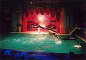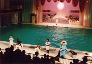 | 屋内大海洋劇場 「ファンタジアム」では、『宇宙物語』と題したパフォーマンスを上演中。宇宙暦3015.41、人類は環境破壊の進んだ地球を捨て、宇宙に移り住んだ・・・って、ハリウッド映画の『WALL・E/ウォーリー』みたいな話ですね。 ご覧のとおりアシカとイルカが共演。手前にいる着ぐるみはペンギンらしい。 |