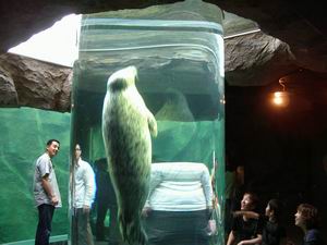 | 2004年6月6日にオープンしたばかりの「あざらし館」。目玉はこのパイプである。上下が大水槽とつながっていて、気が向くとアザラシが上から下へ、下から上へと泳いでいく。 時には客の目の前で静止して、ほとんどにらめっこ状態に。こうなると、どちらが観察されているのかわからない。 |
