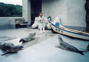 | 下の階で水中を泳ぎ回るアザラシを見た後は、上階に上がって、水面から見る。 ここではマイクを装着したお姉さんが、ミニガイドを兼ねて、エサやりを行っている。 ボートやテトラポットが配置してあるのは、漁村の風景をイメージしているためだ。 |