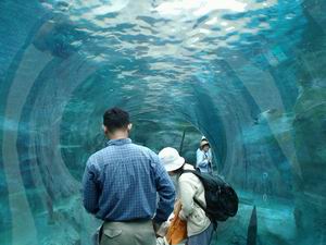 | 「ぺんぎん館」の売りは、プールの中を貫く通路。上下左右をペンギンたちが次々と泳ぎすぎていく。陸上ではヨチヨチ歩きの彼らも、泳ぐ姿は颯爽としたもの。宙を飛んでいるのと錯覚しそうだ。 その場を担当していた(たぶん)ボランティアの方にうかがったところ、通路の材質は厚さ5センチのアクリルだとのこと。雨の日に傘の先端でゴンゴン叩く人がいるそうだが、やめましょうね。 |