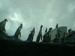 | その通路から見上げると、陸に上がったペンギンが陽炎のようにゆらゆら揺れている。なんだかアーティスティックな絵になった。 SFっぽい雰囲気もあるかな。「地球がペンギンに支配された日」みたいな。そういえば彼らの仲間には、オウサマもコウテイもいたっけ。 |
