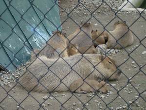 | 惰眠をむさぼるカピバラ。親子で同じ姿勢、同じ顔をして寝ているのがカワイイ。 | |