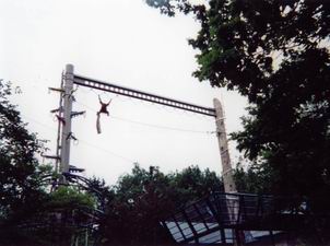 | ちょっと、これ見てくださいよ。こんな「ショー」を見せてくれる動物園は他にない。高さ17メートルのロープの上を“空中散歩”しているのは、メスのオランウータンである。ジャングルで樹上生活をしている彼らにとって、これは日常の一こまなのだ。 こんなところを渡って歩くだけでもすごいのだが、右足には遊び道具の毛布をしっかと握り、お腹には赤ちゃんをしがみつかせている。これなら「D坂」で殺人を犯しても不思議はありませんね。 しかし「猿も木から落ちる」ことはないのだろうか? |