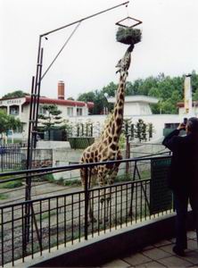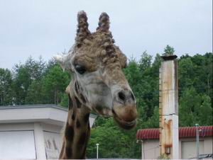 | この総合動物舎は古くからある施設のようだが、やはり三次元の発想は生きている。自然の地形の高低差を生かし、キリンの腰ぐらいの位置に観察台を設けているのである。 キリンと人間が同じ高さに立てば、キリンの顔は、見上げるような位置に来てしまうが、ここではこんなにアップで見える。これは意外に見られない絵面である。 ちなみにキリンの角は何本あるかご存じだろうか? |