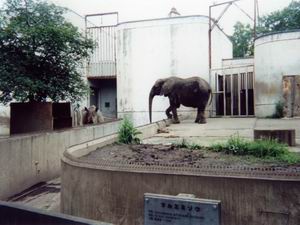 | それぞれの運動場の隅っこで密会し、何やら談合しているマルミミゾウと、ミナミシロサイ。脱走計画でも練っているのだろうか。とりわけサイの人目をはばかる様子はただごとではない。 マルミミゾウとは耳慣れないかもしれないが、中央アフリカの限られた地域にすむゾウである。アフリカ象の亜種でありながら、アジア象よりも体が小さいのが特徴だ。 |