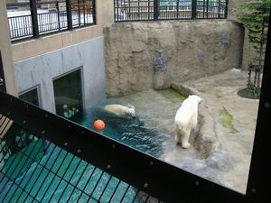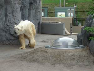 | こちらはもう1つの運動場。透明なドームの中に人間の頭がのぞいているのにお気づきだろうか? ホッキョクグマにしてみれば、これは氷原の隙間からアザラシが顔をのぞかせるのと同じシチュエーションだ。「すわ、エサだ」とばかりに、彼らは近くに寄ってくる(はず)。彼らの習性をそのまま利用した、見事な展示形態である。 アラスカに出かけたって、絶対こんな間近で観察できませんよ。 |