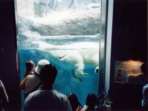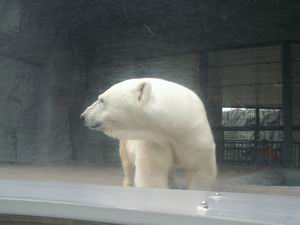 | そのガラス窓から見たのがこの写真。水中と水上の両方が見られるよう、水位が調節されている。 ずんぐりしたホッキョクグマが、楽しげに身をくねらせて泳ぐ様が微笑ましい。 |