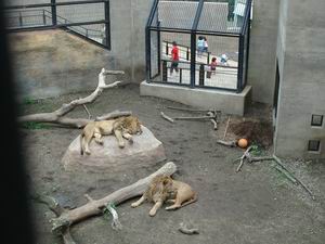 | 日頃動物園に行き慣れた方なら、この構図がいかに画期的なものか分かるはずだ。 他の多くの動物園では、ライオンと来園者が二次元的な位置関係のもとに置かれている。しかもたいていの場合、ライオンは客から遠く離れた場所に陣取り、日がな一日ゴロゴロしているのが通例。エンターテイメント性に乏しいことはなはだしい。 だがこうして三次元の視点を取り入れると、その「ゴロゴロ」でさえも興味深く見られるから不思議である。 |