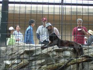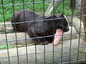 | ところで、こうしておやつを食べている最中にある家族連れが通りかかると、クロヒョウ君、やにわに興奮し始めた。大事な肉をほっぽり出して、その家族を目で追っている。 最初は子供を狙っているのだと、周囲の全員が思っていたが、やがてご婦人の手にした赤いカーディガンに反応しているのだと判明した。 ご婦人が動くとクロヒョウも追う。カーディガンをヒラヒラさせようものなら、鉄格子に飛びつく勢いだ。教訓:ジャングルと闘牛場では、赤い服を避けましょう。 |