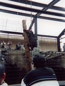 | そのクロヒョウ君も、おやつの時間になるとこうして木を駆け上り、天井から吊り下げられた肉のかたまりにむしゃぶりつく。その動きの素早いことといったら、アンリもオーウェンもかないません。 もらった肉はかなり骨っぽい感じだったが、時間をかけてガリリガリリとかみ砕き、骨まで残さず食べてしまった。 |