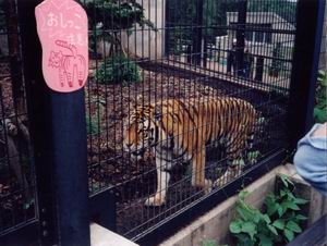 | トラの檻には「オシッコ注意」の掲示が。そう、トラにオシッコをかけてはいけません(違うって)。 ちなみにこのアムールトラは、本来、寒い地方にすむトラである。旭川の冬にも辛い思いをすることはないだろう。 |