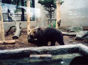 | 以下は旭山動物園復興の先駆けとなった「もうじゅう館」の写真である。 ライオン、アムールトラ、ユキヒョウ、アムールヒョウなどの捕食者を集めた、大規模な施設だ。獣舎を取り巻く階下の遊歩廊からは、動物たちを同じ高さで(二次元的に)観察することができる。さらに階上の観察スポットに上がれば、猛獣たちの姿を上から(三次元的に)俯瞰することができる。 写真はエゾヒグマ。“地元の顔役”だけに、態度も堂々としたものだ。 |
