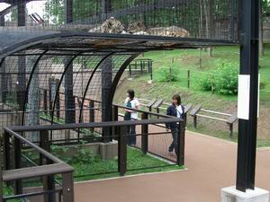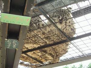 | 旭山動物園で最もユニークな展示形態の1つ。遊歩廊に沿って何気なく歩いてきた来園者が、何者かの気配に気づいてふと頭上を見上げると、そこにはユキヒョウが鎮座ましましている。ビックリである。 別にアメやムチで釣って、ここに座らせているわけではない。これも高いところにいるのを好むヒョウ本来の生態を利用しているのだ。 |