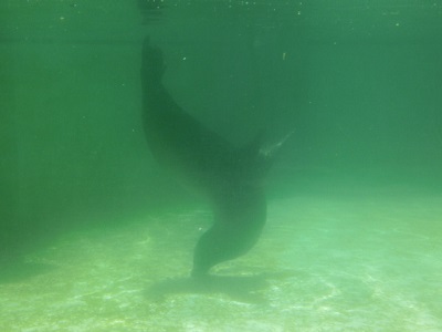 シンクロナイズドスイミングの練習をするカリフォルニアアシカ。 ここと隣のケープペンギンの園舎は2階建て構造で、上の階からは陸に上がった姿と水面からの眺めが、そして全長86メートルの地下通路からは水中の泳ぎっぷりが堪能できる。 惜しむらくはご覧のとおり、水は濁りだらけ、プールの床と内壁は青カビ(青藻?)だらけ、強化ガラスはほこりだらけ。千葉市の予算ではそう頻繁にプール内の清掃はできないかもしれないが、ガラスはいくらでも拭けるのだから改善をぜひお勧めしたい。募集をかければ、おそらくボランティアを希望する中高年が殺到するのではないかしら。 |