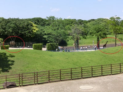 | 展望デッキから「草原ゾーン」を見晴らすと、アフリカのサバンナさながら・・・とはいかないものの、こうしてキリンやゾウが見える(あいにく、このゾウさんはアフリカゾウではなく、アジアゾウなのだけれど)。 手前の草地にはダチョウやシマウマもいるので、気長にシャッターチャンスを待てば、もっと多くの動物をフレームに入れることができるはずだ。 この園には猛獣がいないのが残念・・・と思ったが、公式ホームページによれば、2015年度にライオン展示施設の建設に着工するらしい。うまく高低差をつけて、ライオンたちがただゴロゴロしている姿さえも楽しく観察できる設計にしてほしいものです。 |
