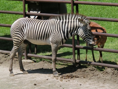 柵をはさんで妙に親密にしていたシマウマとシタツンガ。 「シタツンガの奥さん、僕と逃げてください」 「無茶を言わないで。私はウシ科で、あなたはウマ属。私たち、なさぬ仲なのよ」 「でも奥さんはウシの仲間には見えない」 「ウマの仲間にも見えないでしょ。だいたい、逃げてどこに行こうというの?」 「僕が船橋競馬場で働きます。奥さんもウシ科なら牛乳を行商すればいい。小金を貯めたら、マザー牧場に小さな家を買いましょう」・・・というような秘め事を、顔を寄せあい、唇を絡ませ、延々と語り続ける2頭であった。障害の多い恋人たちに幸多かれと祈らずにいられない。 |