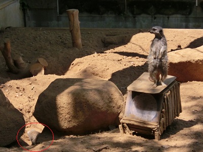 | “高台”に登って油断なくあたりを警戒するミーアキャットの親分。 左下では子分がモーレツな土煙を立てながら、地面を掘っている。 |