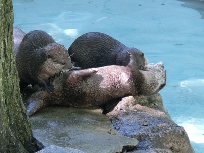 | 「そーら、くすぐれ!」「キャハハハ、やめてやめて!」という感じでずっと仲良くじゃれ合っていたコツメカワウソたち。 | ![]() |