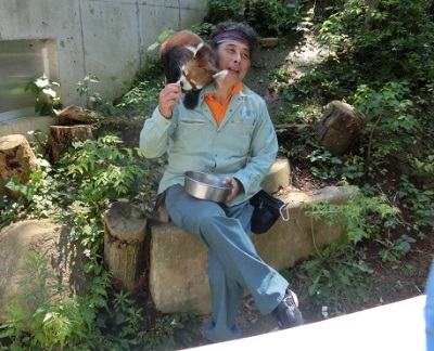 | エサやりタイムには、こうして職員さんが飼育場の中に入り、ミニガイドをしてくれる。肩に乗っているのは風太くんの孫にあたる源太くんだ。 この職員さん、知識が豊富なのはもちろんのこと、それぞれの個体が見せる動きを拾って上手に笑いを取ってくれるので、とても楽しませていただいた。 残念なのはしゃべりながらすーっと引っこんでいかれたので、聴衆一同、それで終わりとは思わず、拍手をするチャンスがなかったこと。「タレントじゃあるまいし、拍手を要求するようなハシタないことができるかい」と思っておられることは十分に想像できる。できるのだが、そこは割り切って気持ちよく拍手をさせてほしいし、自然体で称賛とねぎらいを受けてくれたらいいのにな。 |