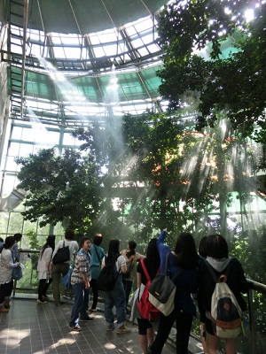 「動物科学館」の中にあるバードホールでは、こうして一定の時間になると“スコール”が降る。 木々の間では熱帯の鳥類が飛びまわっていて、「フンに注意」の警告も。 |