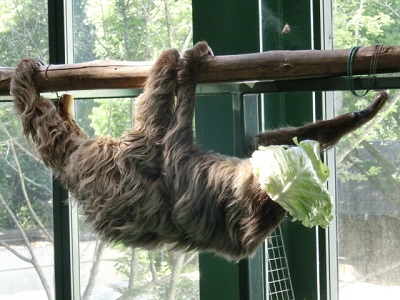 | バードホールにはヒマラヤの雪男ならぬ、フタユビナマケモノも2頭いる。個体名は「おばあちゃん」と「おとうさん」であるらしい。 スコールの降る時間がエサやりタイムになっていて、手すりにはおいしそうなリンゴやバナナもたくさんぶら下げられるのだが、このナマケモノは大きなキャベツの葉っぱを確保。その場で食べれば楽なのに、こんなおかしな格好で(かぶるのはパンツだけにしなさい!)わざわざお気に入りの場所まで運んでいくんですね。 ちなみにナマケモノって、亀みたいに動きがゆっくりした動物というイメージを持っていたのだが、こいつは(速いとは言わないけれど)亀ほど動きが遅くない。飼育下ではそれほどエネルギーを節約しなくていいからか。 |