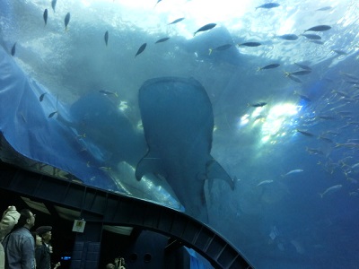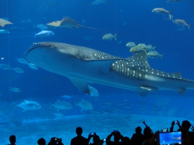 | 美ら海水族館の目玉は何と言っても2匹のジンベエザメ。 前回ここを訪ねたときにはリニューアル工事中だったので、この深さ10メートル、幅35メートルの大水槽「黒潮の海」ができてからは初めての訪問になる。 |