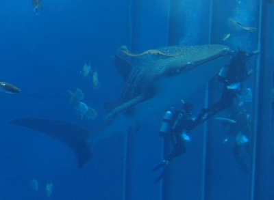 | 掃除中のダイバーが食われそう・・・に見えるが、ご存じの通りジンベエザメはプランクトンみたいなものしか食べない。 給餌タイムには上から投入される餌を、直立状態になって吸い込む構図に。 |