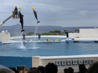 | 伊江島をバックにした「オキちゃん劇場」ではイルカのショーが。バンドウイルカやゴンゴウイルカなど3種類が混成チームを組んでいた。 “出演者”のうちの2頭は芸歴40年になるのだとか。たとえば犬と比べると、ずいぶん長生きなんですね。やはり魚食と水泳は体にいいのか(そういう問題か?) |
