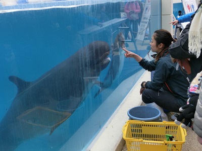 ショーのあとはイルカ観察会。体温の測り方など、日頃の飼育の様子を紹介してくれる。 H・R・ギーガーはエイリアンをデザインするとき、このゴンドウイルカを参考にしたのではあるまいか。 |