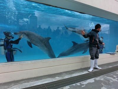 | 続いてダイバーショー。イルカとダイバーがチームを組んで、エコーロケーションを利用した芸などを見せてくれる。 最前列に座ると水をかぶるので油断禁物。 |