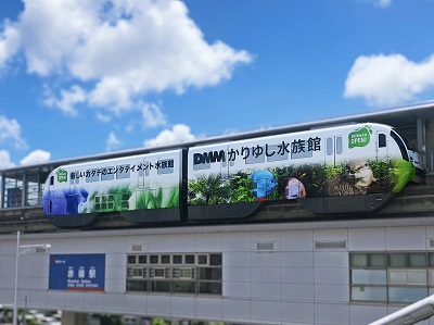 2年ほど前から、沖縄のモノレールにはこうしたラッピング車両が見られるようになっていた。DMMといえば映像配信系の会社だから、きっとこの水族館というのはネット上のバーチャル水族館だよねと思っていたのだったが・・・。 写真は下記よりいただきました。 https://twitter.com/dmm_kariyushi/status/1166526432647925760/photo/2 |