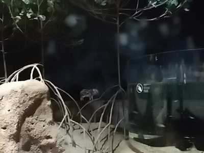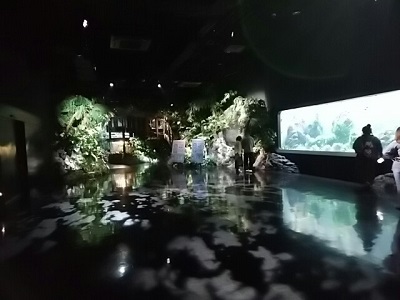 これが最初のゾーンで、(一応)亜熱帯の森が再現されている。 この水族館は館内マップも配っていなければ、水槽に生き物の説明も掲示しておらず、そういうのは全部スマホのアプリで見てくださいねというシステム。GPSで客の位置情報を把握して、その近辺にいる動物を案内する。私は日頃スマホを使い慣れていないので、操作がけっこう煩わしかった。 |