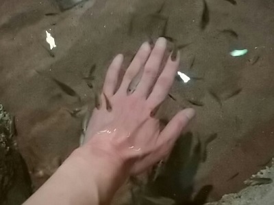 | 私の白魚のような指をついばむソウジウオ。「おにいさんの指は清潔すぎて、おまんまの食い上げだよ!」と文句を言われた。 わさわさ寄ってくるくせに、少しでも手を動かすとパッと逃げ去ってしまうので、写真が非常に撮りにくい。でも金魚すくいの網があれば捕れそうではあるか。 |