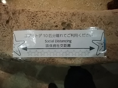 お触りコーナーではほかにもナマコやサメなどに触ることができる。とはいえ人間同士の密は避けましょうねということで、こんな掲示が。 |